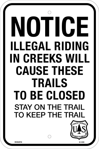 12 x 18 x .080 Alum. Sign - "Notice - Illegal Riding In Creeks Will Cause These Trails To Be Closed, Stay On The Trail To Keep The Trail", w/ USFS Logo, Wht/Blk, EG