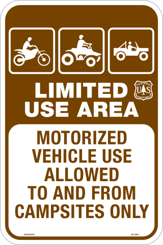 12 x 18 x .080 Alum Sign - "Dirt Bikes, ATV, 4WD Symbol; Limited Use Area; Motorized Vehicle Use Allowed To And From Campsites Only", w/ USFS Logo, Wht/Brn, EG