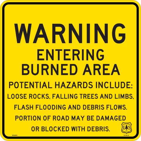 Alum. Sign - "Warning Entering Burned Area - Potential Hazard Include...", w/ USFS Logo, Yel/Blk, HIP