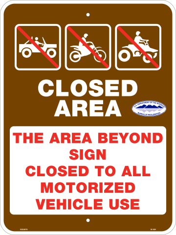 18 x 24 x .080 Alum. Sign - "Closed Area - The Area Beyond Sign Closed To All Motorized Vehicle Use", w/ BOR Logo, Wht/Brn/Red/Blu, EG