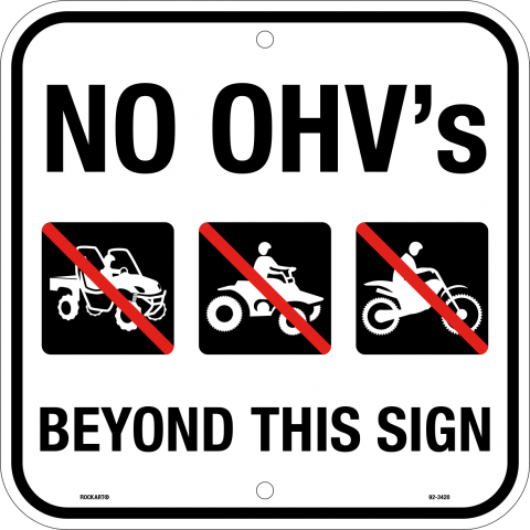 12 x 12 x .080 Alum. Sign - "No OHV's Beyond This Sign", W/ No Side By Side, No ATV, No Motorbike Symbols, Wht/Blk/Red, EG